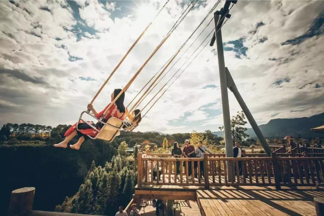 2.玩法:棧道上空掛滿了的五顏六色的布傘,盡頭是懸掛在天生江上的懸崖秋千,每5分鐘30元,讓身體在亞歐印板塊之間來回凌空擺蕩,刺激和美景兩不相忘。建議恐高、膽小、有心血管疾病的不建議嘗試。