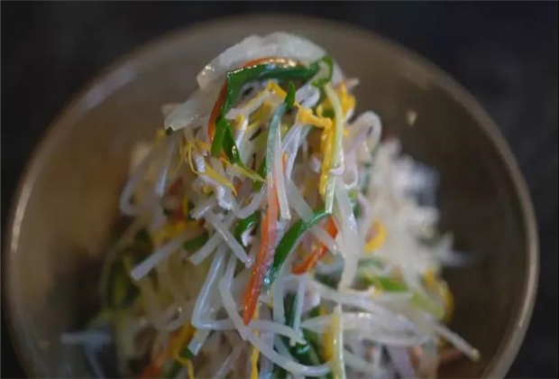 細串采用當季的時蔬洋絲瓜、豆芽、韭菜搭配火腿、蛋片、里脊炒制。食材除豆芽、韭菜保留天然形狀外,其余都切成極細的絲狀。這三葷三素的搭配看似家常,實則精妙,熱油下鍋速炒幾秒便呈現出清脆、鮮香的口感,令人開胃。