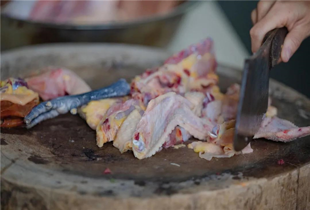用老雞、老鴨、里脊肉切成大塊焯水去除血沫后,再加上以咸鮮聞名的云南宣威火腿放入砂鍋中加水熬制,文火熬煮整整6個小時后,湯色清亮如水,但滋味十分濃郁鮮美。在熬湯的過程中,干貨海參已經用水發好切片,雞脯肉被捶打成泥放入模具上鍋蒸熟,時鮮冬筍切絲,這些食材被放入熬制好的高湯中,海參筋道彈韌,雞脯肉泥細膩綿密,包裹上湯汁鮮味十足。