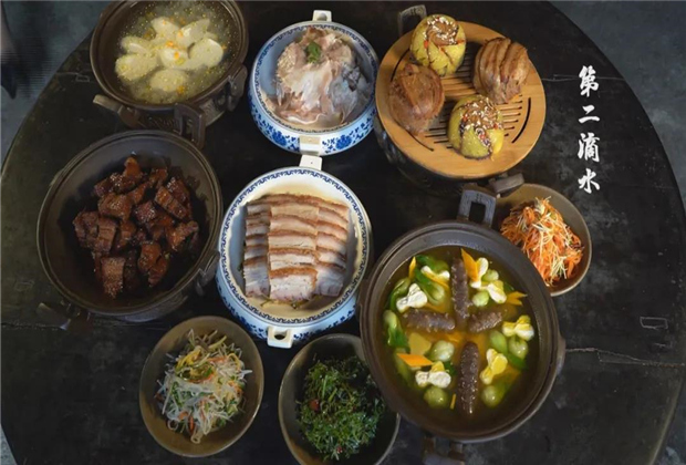 和順“三滴水”作為家宴,較之一般宴席呈現出選材考究、加工精細的特點,制作的菜肴也以清爽養生居多。芙蓉什錦海參湯就是其中的典型代表。
