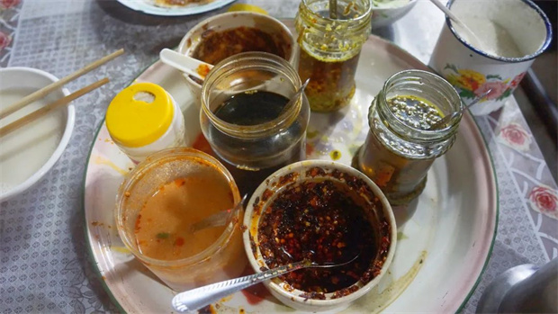 烤好的飯團可以搭配十幾種醬料,燒椒醬、各種麻辣醬、花生碎、水豆豉、折耳根醬……吃烤飯團當然得配上燒椒醬啦!先抹上一層麻辣醬,再來上兩勺燒椒醬,一勺水豆豉、一勺花生碎,一口下去,簡直不要太完美!