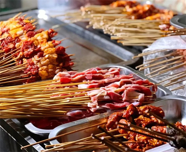 夜晚的燒烤攤最是熱鬧,牛肉、羊肉、五花肉,各種肉類、蔬菜串成串,整整齊齊地擺放在盤子里,任由你挑選。