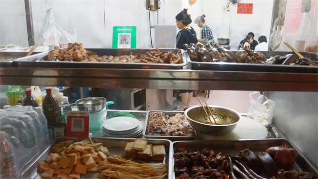夜晚的店里分門別類的擺放著鹵好的豬頭肉、豬耳朵、肥腸、豬肚、豬尾巴、豬心、豬肝等十幾種部位,隨便選上你喜歡吃的幾種,加上特制的鹵湯,加上自己心儀的各種調料,一碗美味的燒臘就完成了。
