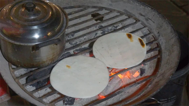 飯團是奶奶提前捏成一個個圓形的餅狀,放在炭火上慢慢烤,先均勻地刷上一層香油,再撒上一些草果面,等炭火把表面烤至金黃時就好了。