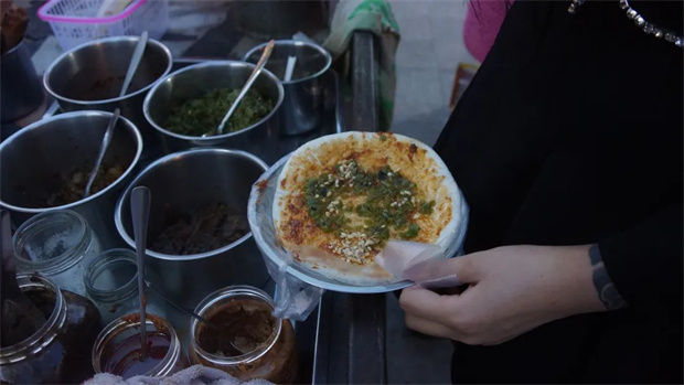 烤好的風吹粑粑,在表面抹上辣醬、花生碎,又或是舀上一勺稀豆粉,一口下去,既有被炭火烤得酥脆的米香,又有各種調料帶來的麻辣鮮香。