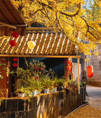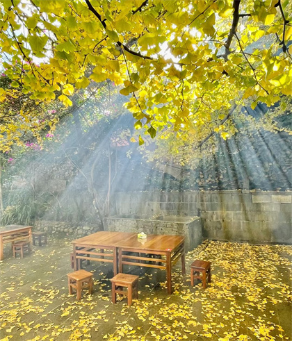 古樸的建筑在銀杏樹下更添了幾分滄桑,田間、路上、墻頭邊、菜地金黃一片。漫步村中小巷,不經意間,銀杏葉灑滿一身,此番意境,你會禁不住端起相機,將所有的美景收于鏡頭中。站在矮墻邊,探身往庭院里看,就能見到院子里挺拔的銀杏樹,落葉覆蓋著屋頂,撒滿了院子的空地晨起的霧靄在朝陽的照射下,透過樹縫,如萬丈光芒灑落人間。