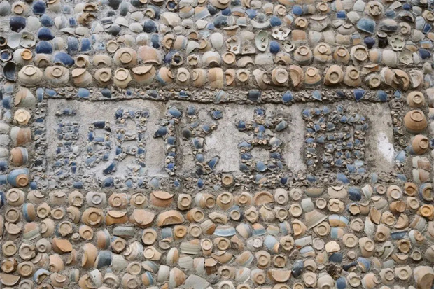 馬站碗窯村還有一道獨(dú)特的風(fēng)景線——由鳳儀寺主持常清師父修建的土陶墻。墻體裝飾著的碎陶片,來(lái)自地基坡頭孫氏