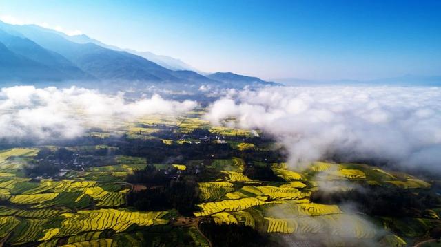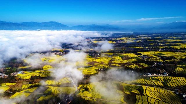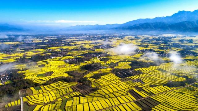 二月末,寒氣逐漸消退,春風伴著細雨把色彩鋪灑在大地上。看,那一抹抹明黃在迅速蔓延著,是的,田疇之間的油菜花開了,無邊無際,就像鋪在大地上的絨毯,在群山之間,藍天白云下,描繪出一幅幅最美的阡陌畫卷。
