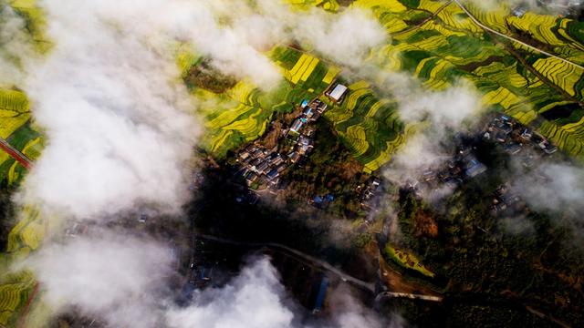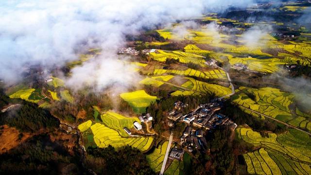 金色油菜花海,宛若像富麗堂皇童話世界。空曠的田野里漾著耀眼金黃,遠處青山隱隱含黛,山峰下村莊錯落有致,藍天上白云飄逸悠游,空氣里菜花芳香彌漫,儼然一副散著金光美不勝收田園立體畫。
