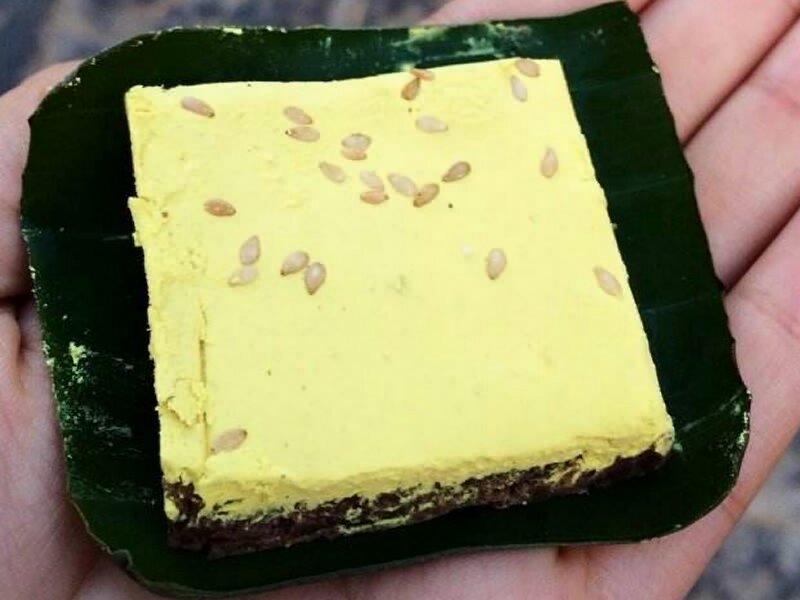 “松花糕”是騰沖的特色小吃,以松花粉、紅豆制成。松花糕通常被呈放在綠色的芭蕉葉上,上層松花粉的金黃、中層紅豆沙的醬紫、下層芭蕉葉的碧綠,層次分明的色澤,不經意間就吸引了路人的目光。