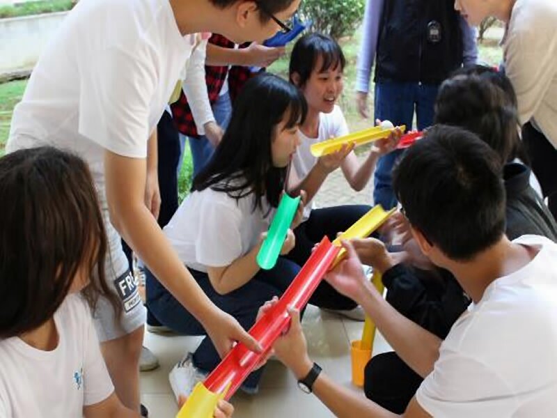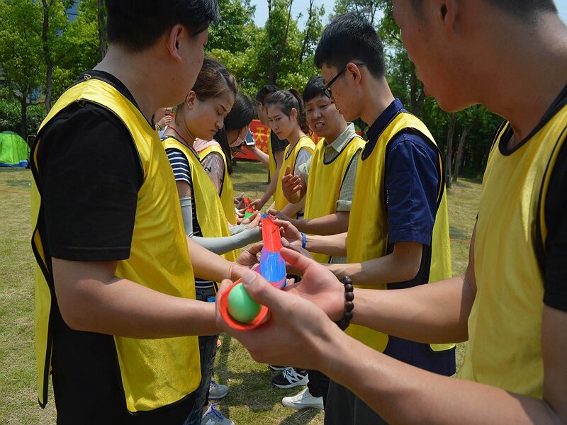 9、如果是10到30人,所有人圍成一個圓圈,每人手拿球槽,然后讓球在球槽中滾動傳遞,在球不掉落的情況下傳遞5圈則為成功。