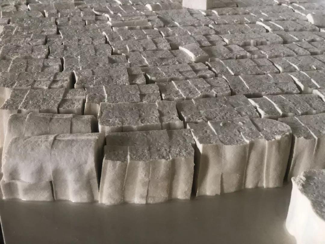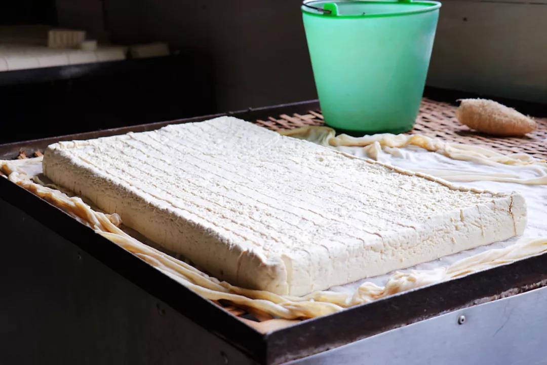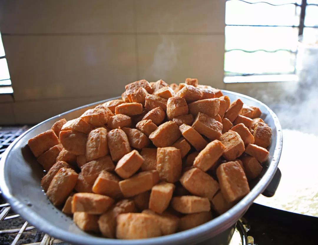 最后,撈去漂浮于表面的泡沫,再放入比例恰當的酸水,豆花就此凝成。倒入磨具壓制,壓制成型之后將做好的大塊豆腐用刀切成小塊,放到陰涼處晾干,這便是我們最常吃的尋常豆腐了,而金雞口袋豆腐則需在此之上再經一次神奇的轉化。“金雞口袋豆腐把晾干切塊的豆腐放入油鍋炸至表皮金黃酥脆,做成方便存儲的油炸豆腐后,再把炸好的豆腐放到土堿水中浸泡。”高文金說。